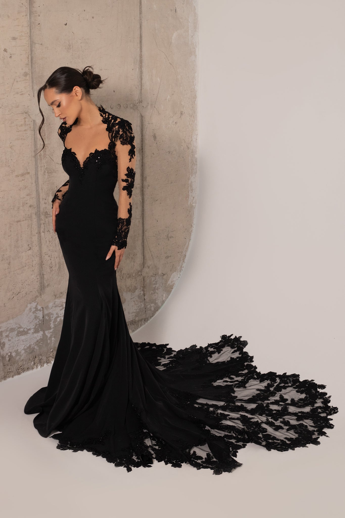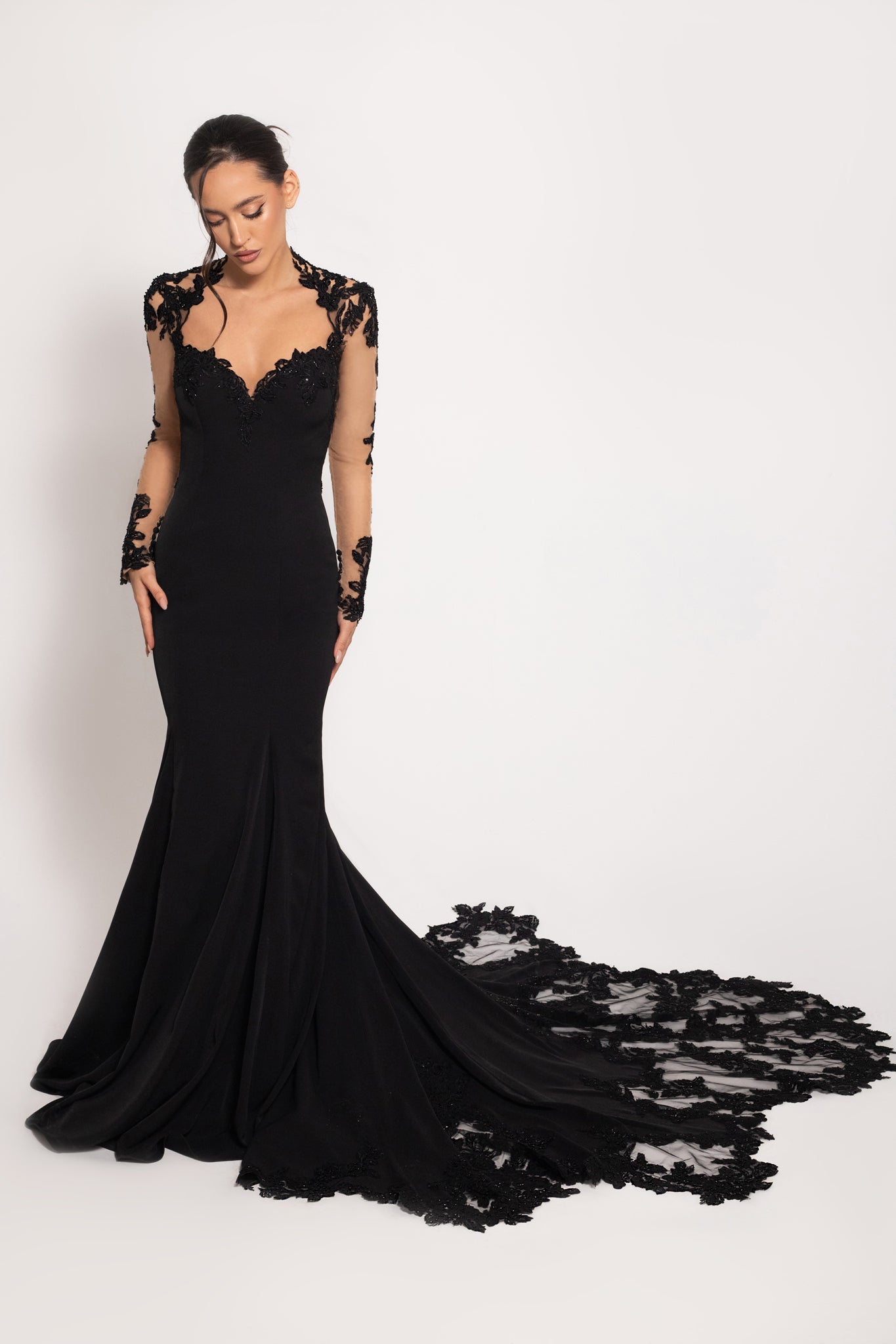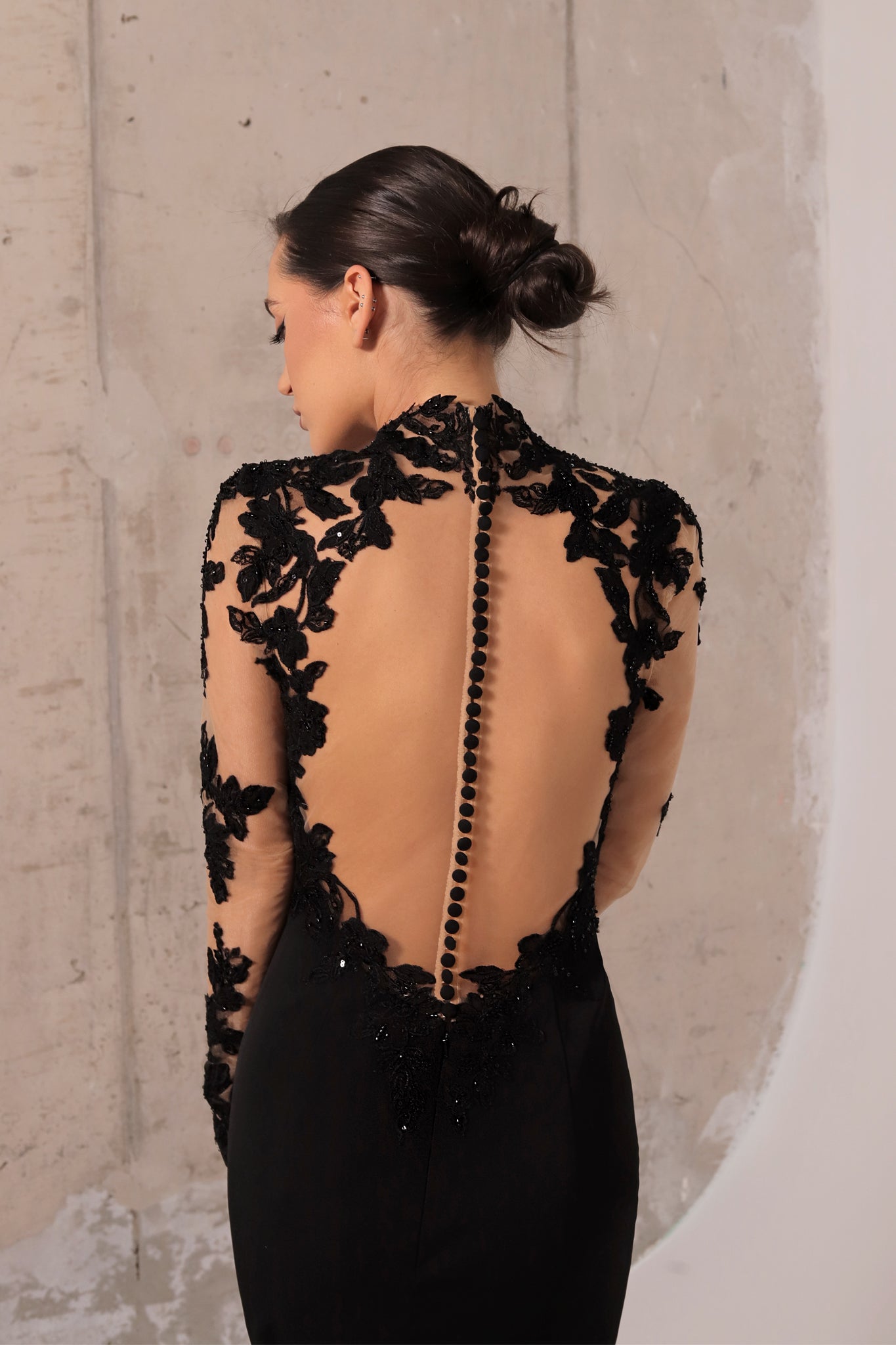 Illusion back with turtleneck finished with hand embroidered lace appliques