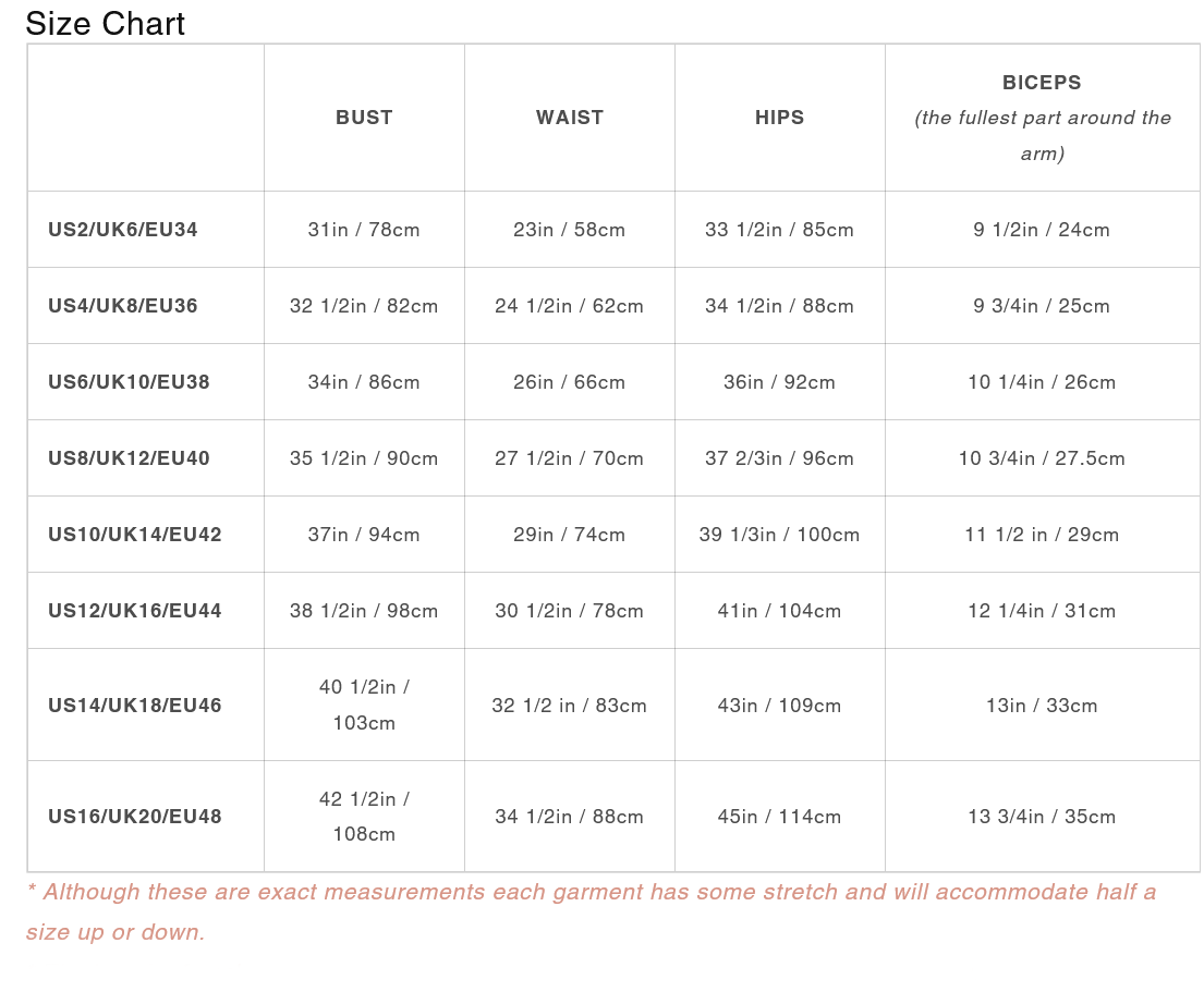 * Although these are exact measurements each garment has some stretch and will accommodate half a size up or down.