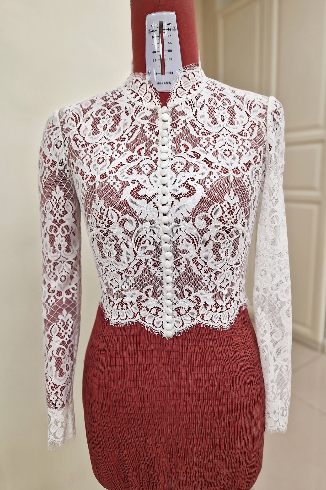 All of our lace boleros are handmade by a team of professional seamstresses in a real couture Atelier. We use the most beautiful laces which we carefully select in Paris every year.