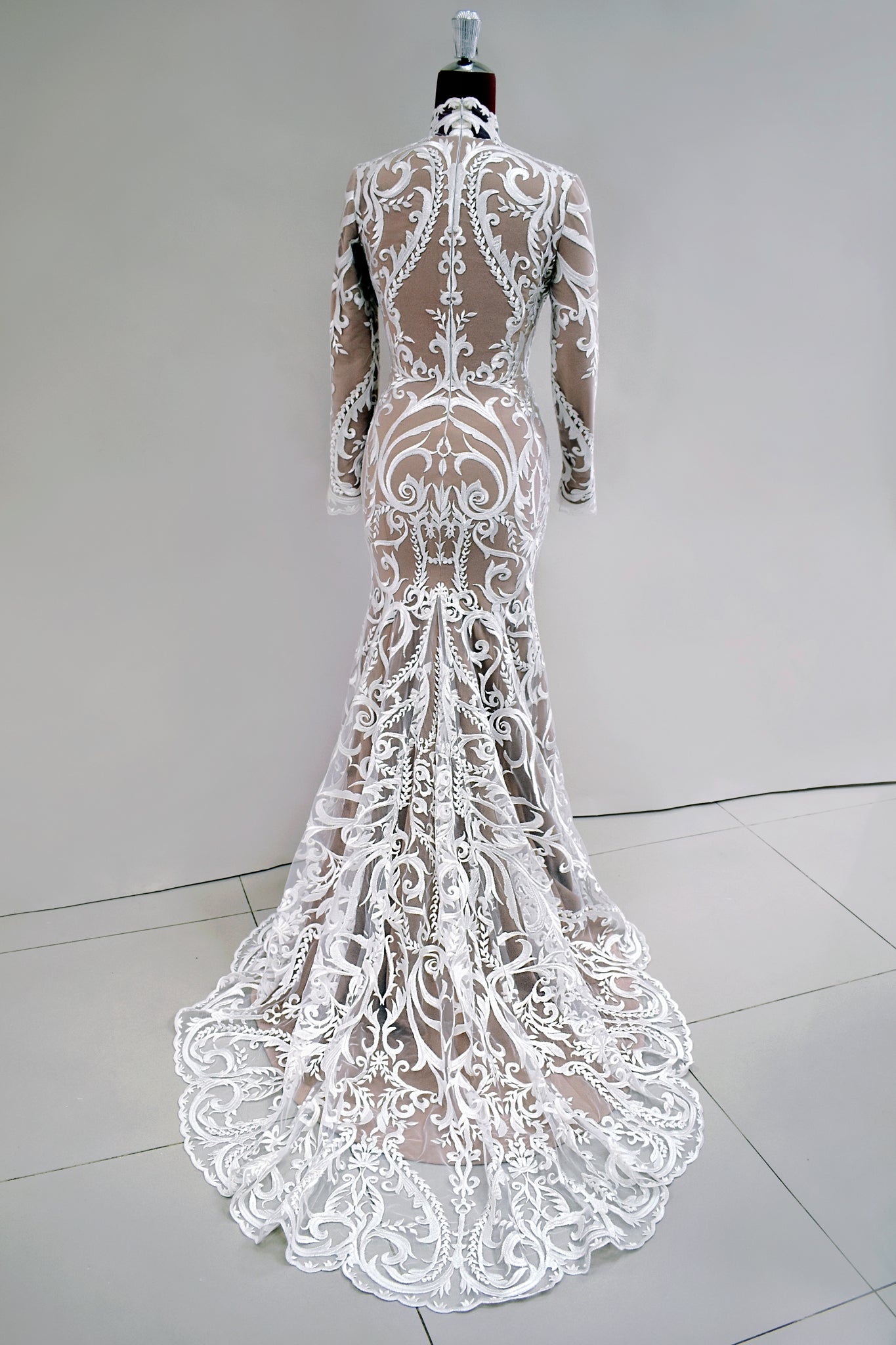 Fit and flare silhouette with lace fishtails for a more dramatic flare