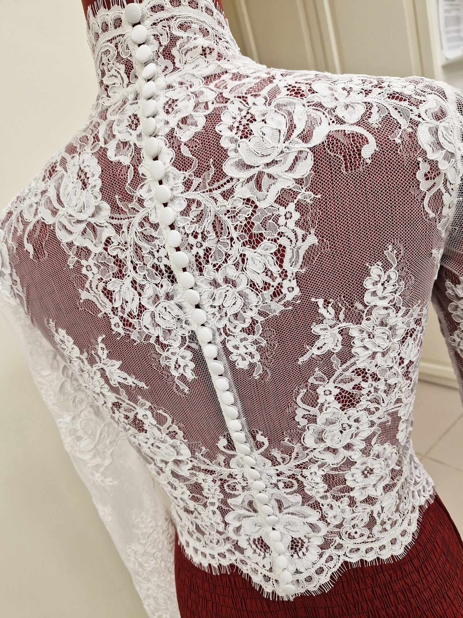 All of our lace boleros are handmade by a team of professional seamstresses in a real couture Atelier. We use the most beautiful laces which we carefully select in Paris every year.