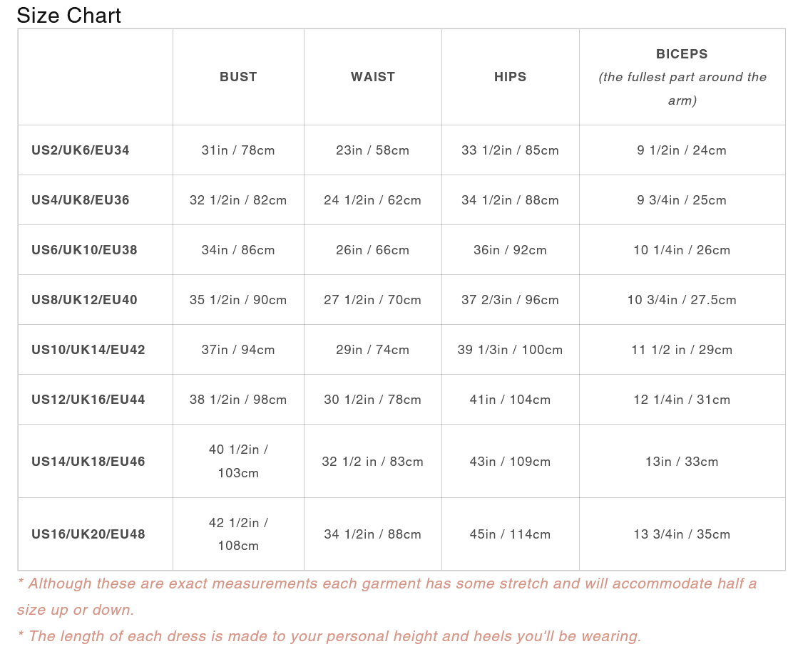 * The length of each dress is made to your personal height and heels you'll be wearing.