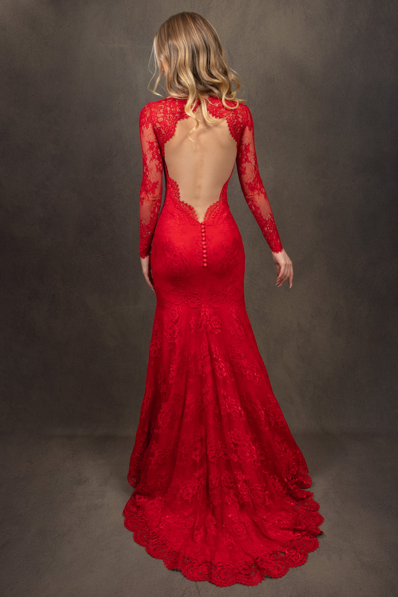 It has a jaw dropping deep plunging neckline, stunning keyhole back, figure flattering silhouette and is made of a gorgeous red Chantilly lace with enchanting rose flower pattern.