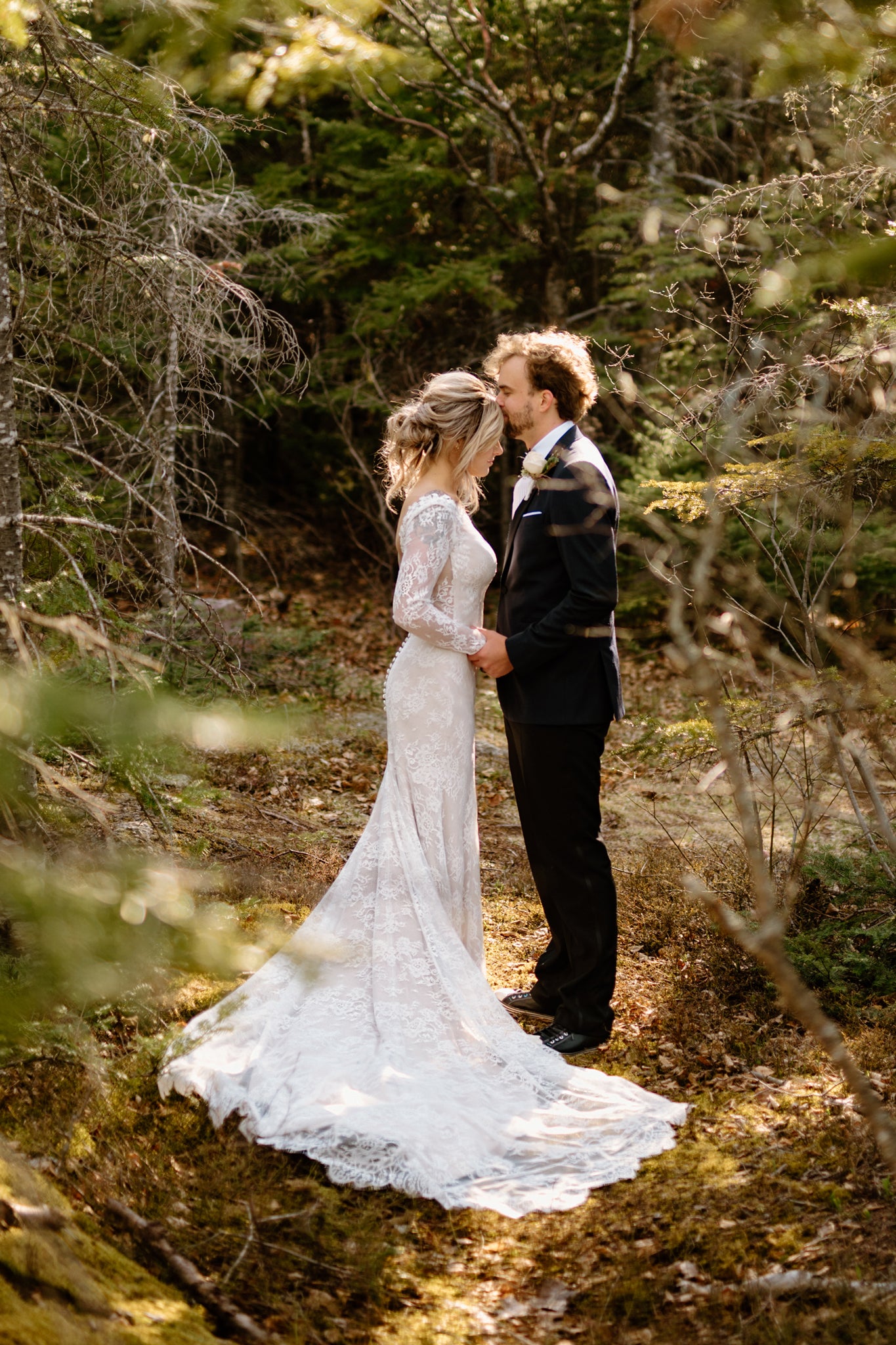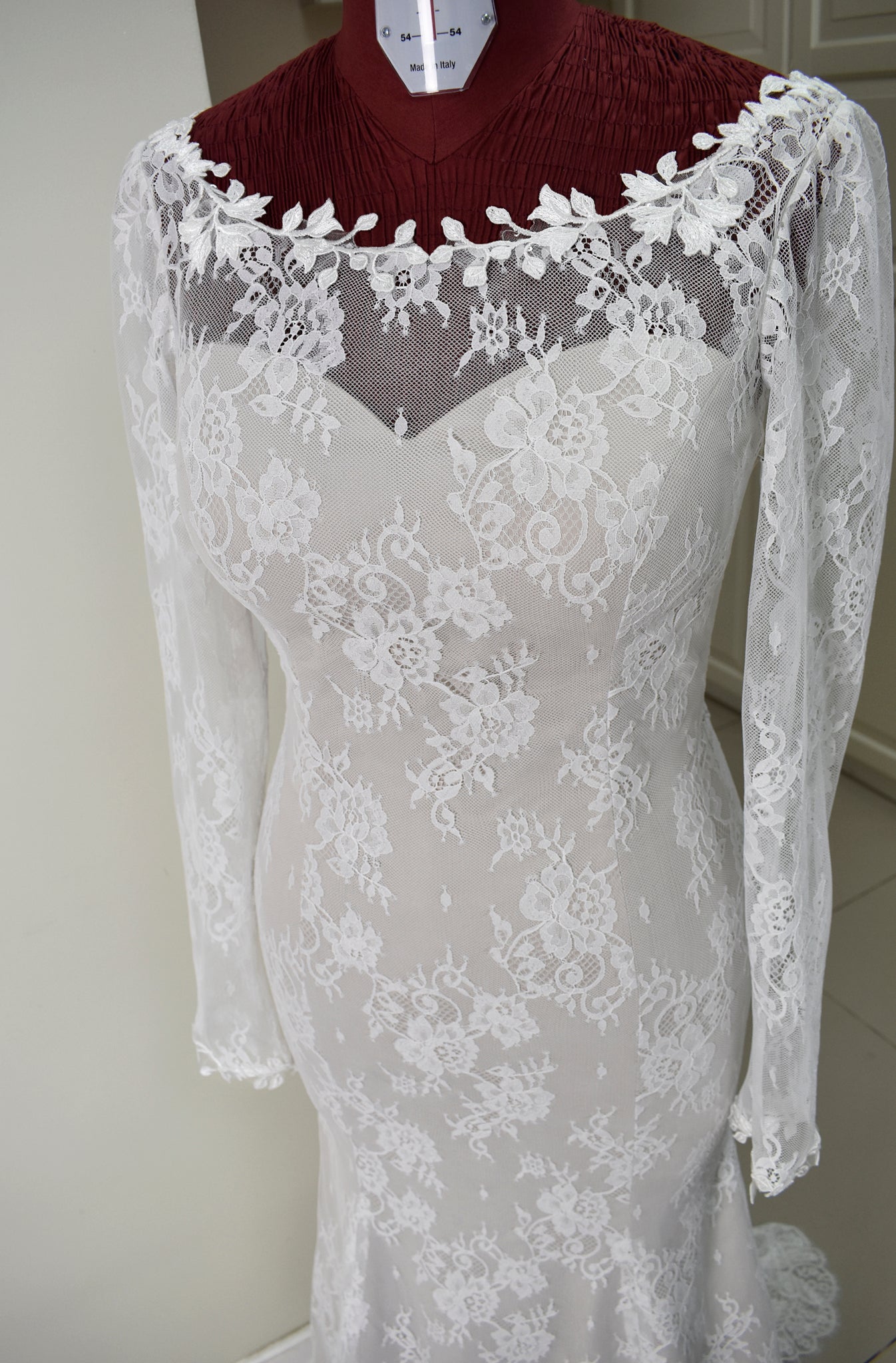 Illusion lace boat neckline with hand attached lace appliques;