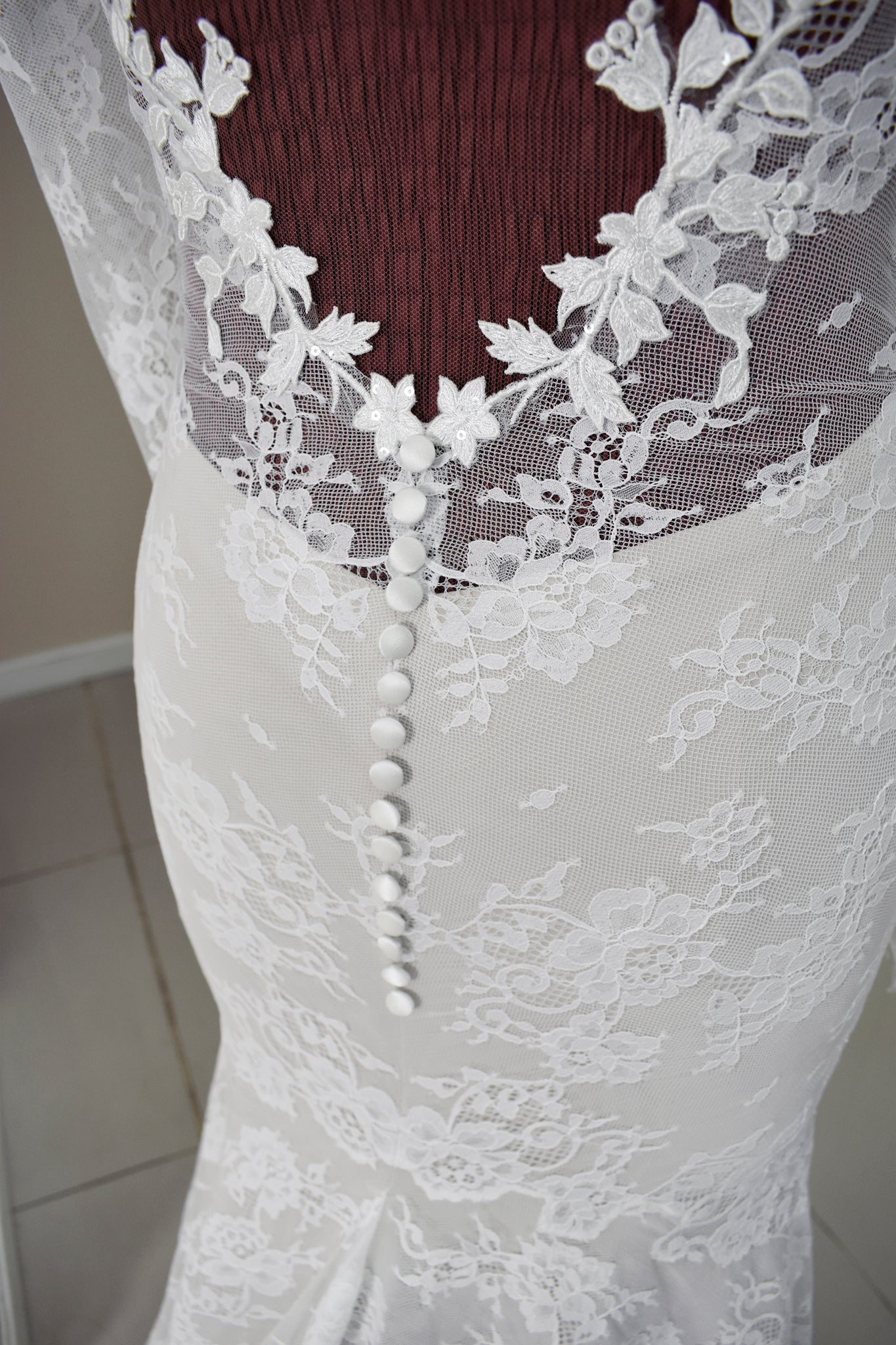 Illusion lace V-back finished with hand attached lace appliques