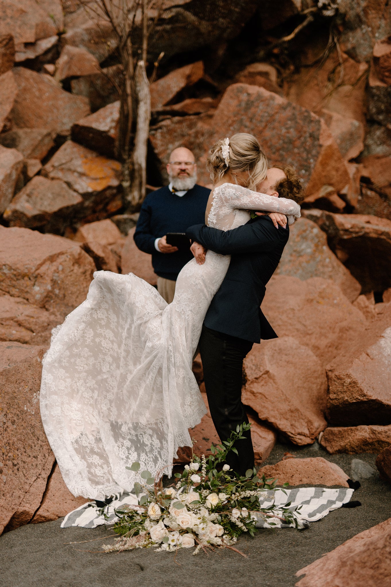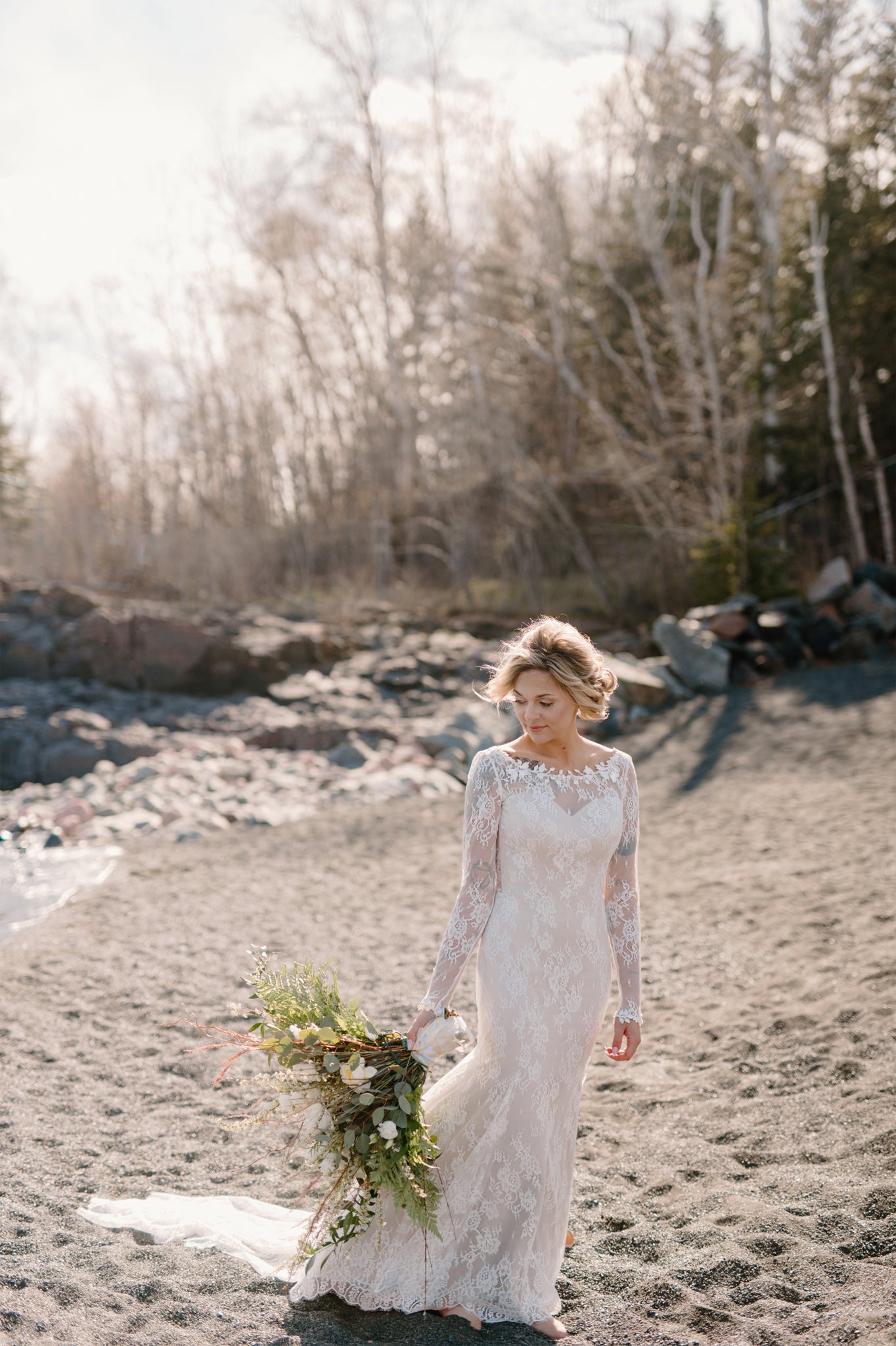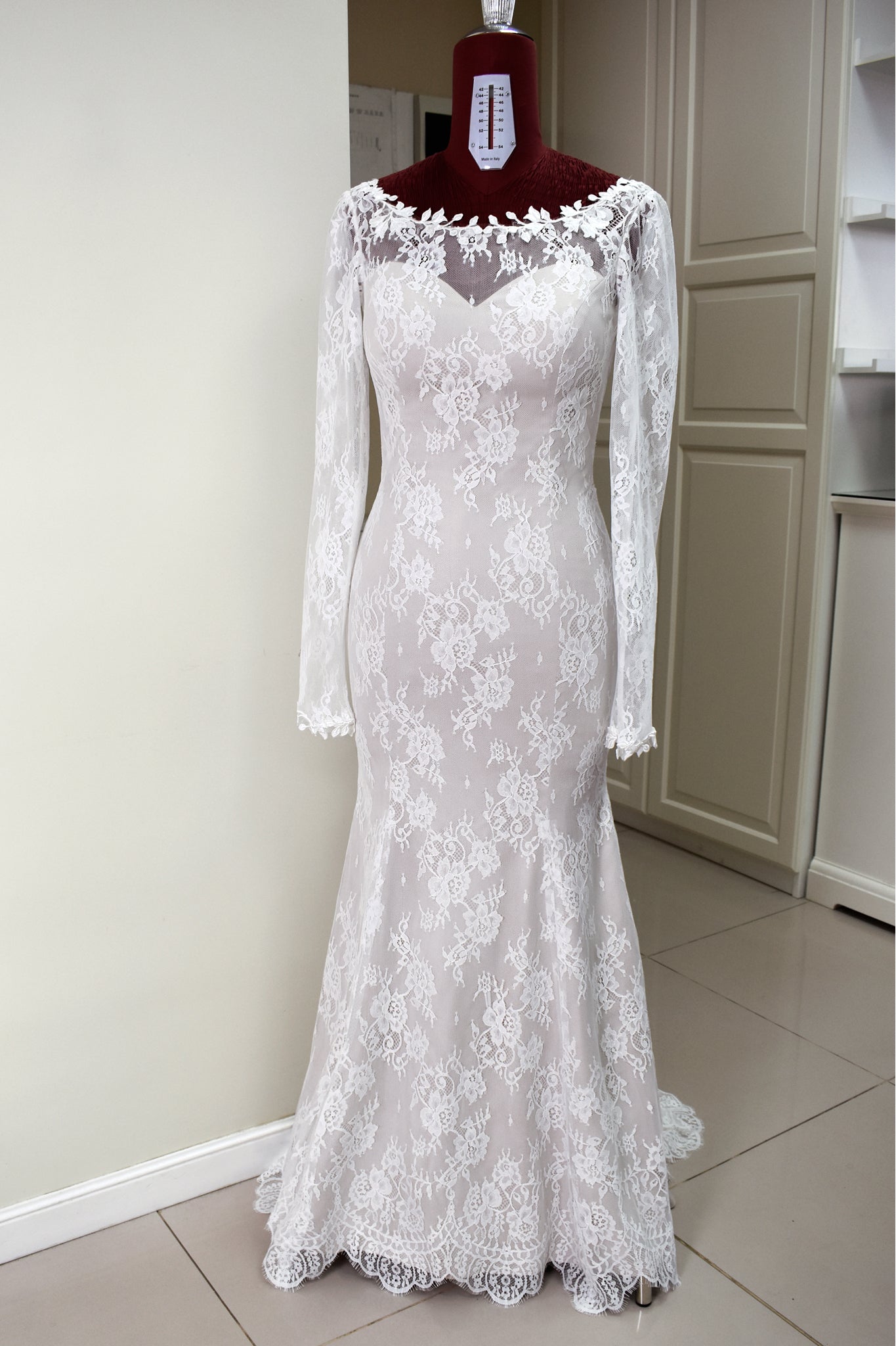 Long lace sleeves with lace appliques at wrists